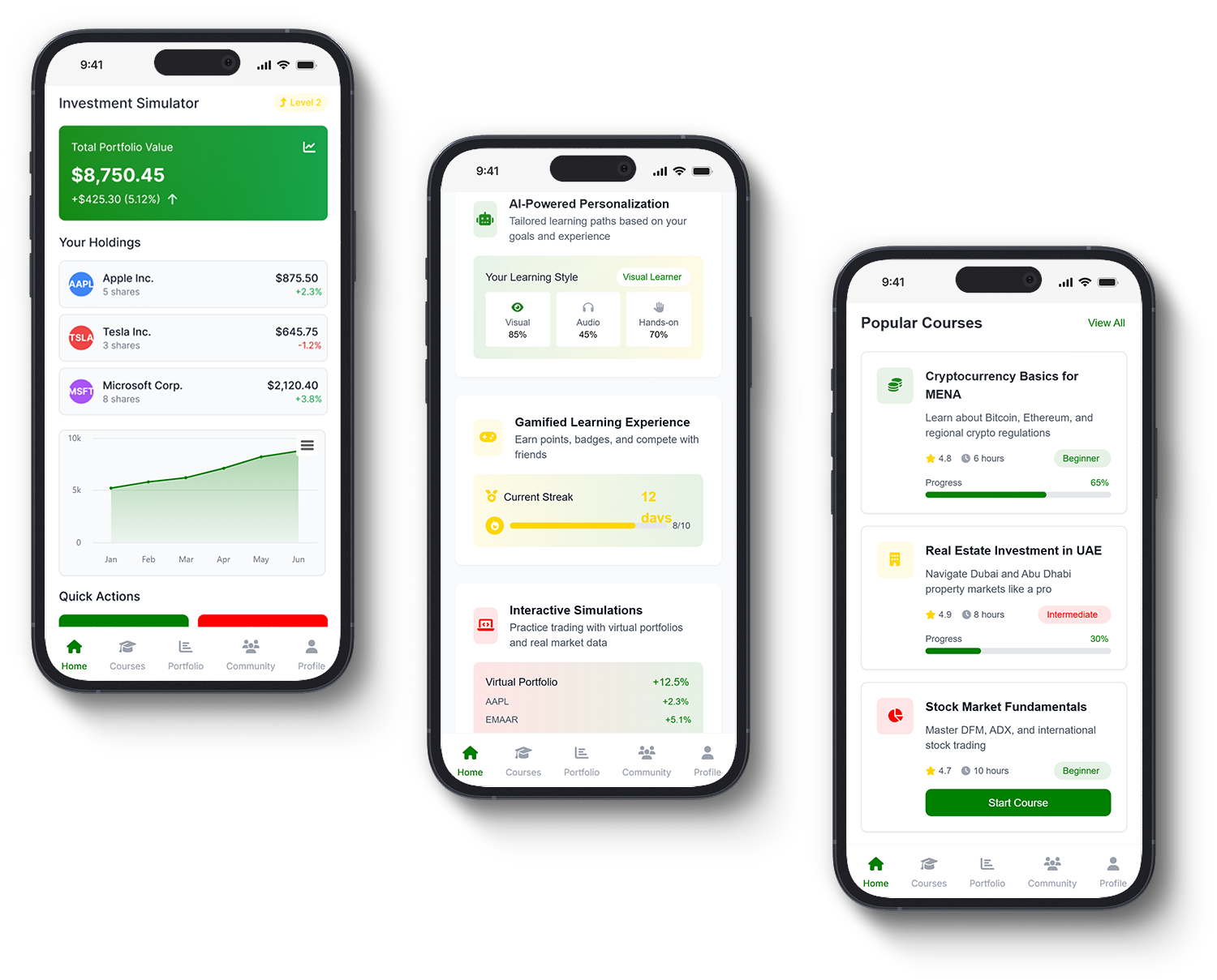 AI that personalizes your learning path based on your goals, whether reducing debt or building an emergency fund. Gamification keeps you motivated with badges and streaks, while interactive tools let you practise without risk, like virtual portfolio simulations. And because life in Dubai is fast-paced, everything’s offline-ready and bilingual (Arabic/English). Supported by UAE government initiatives like the ADIB 2025 Financial Education Programme, we’re here to help you thrive.