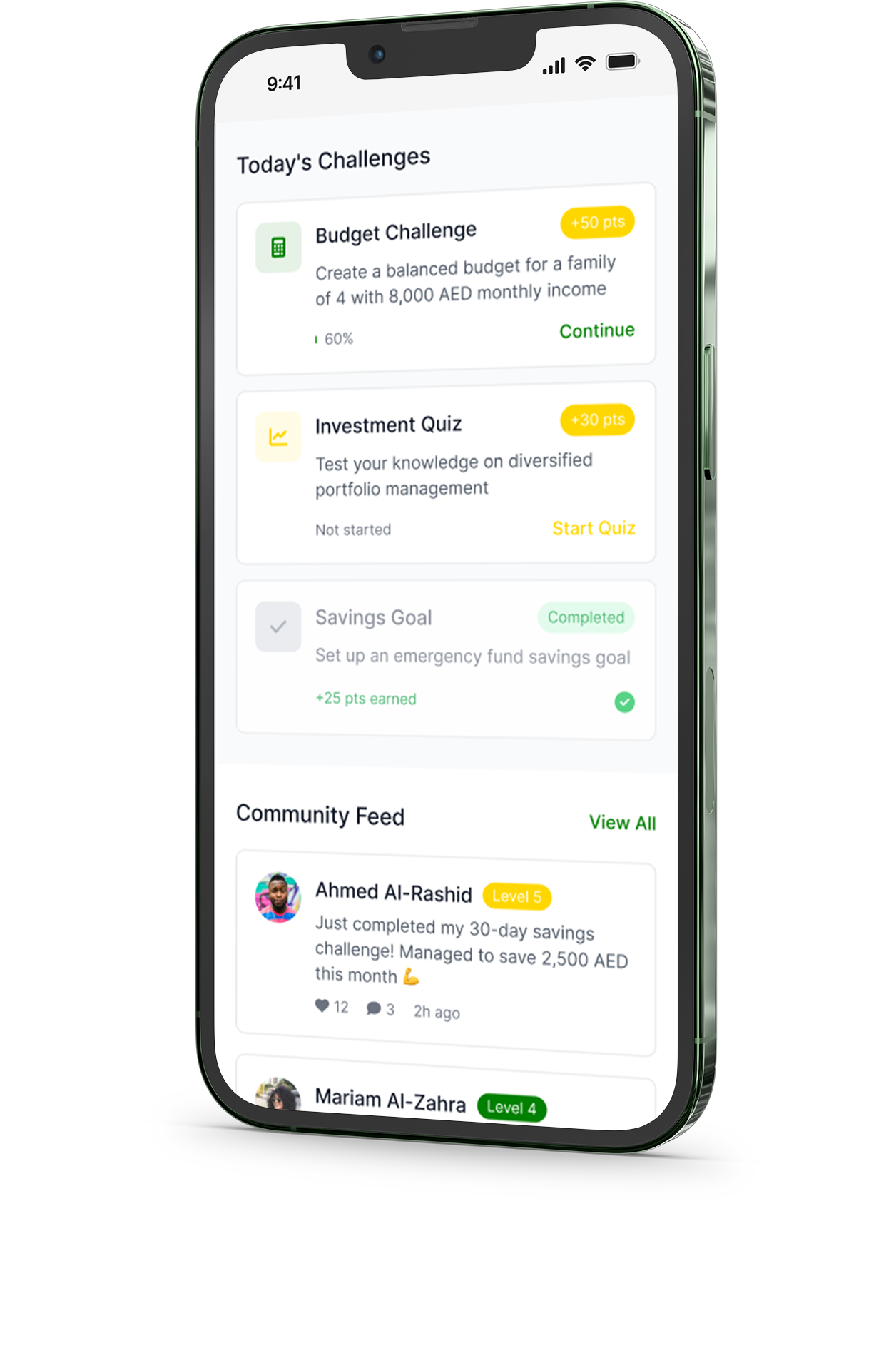 Stay motivated with badges, streaks, and leaderboards that make financial learning engaging. Track your progress and compete with UAE users, turning budgeting and investing into a rewarding experience.
