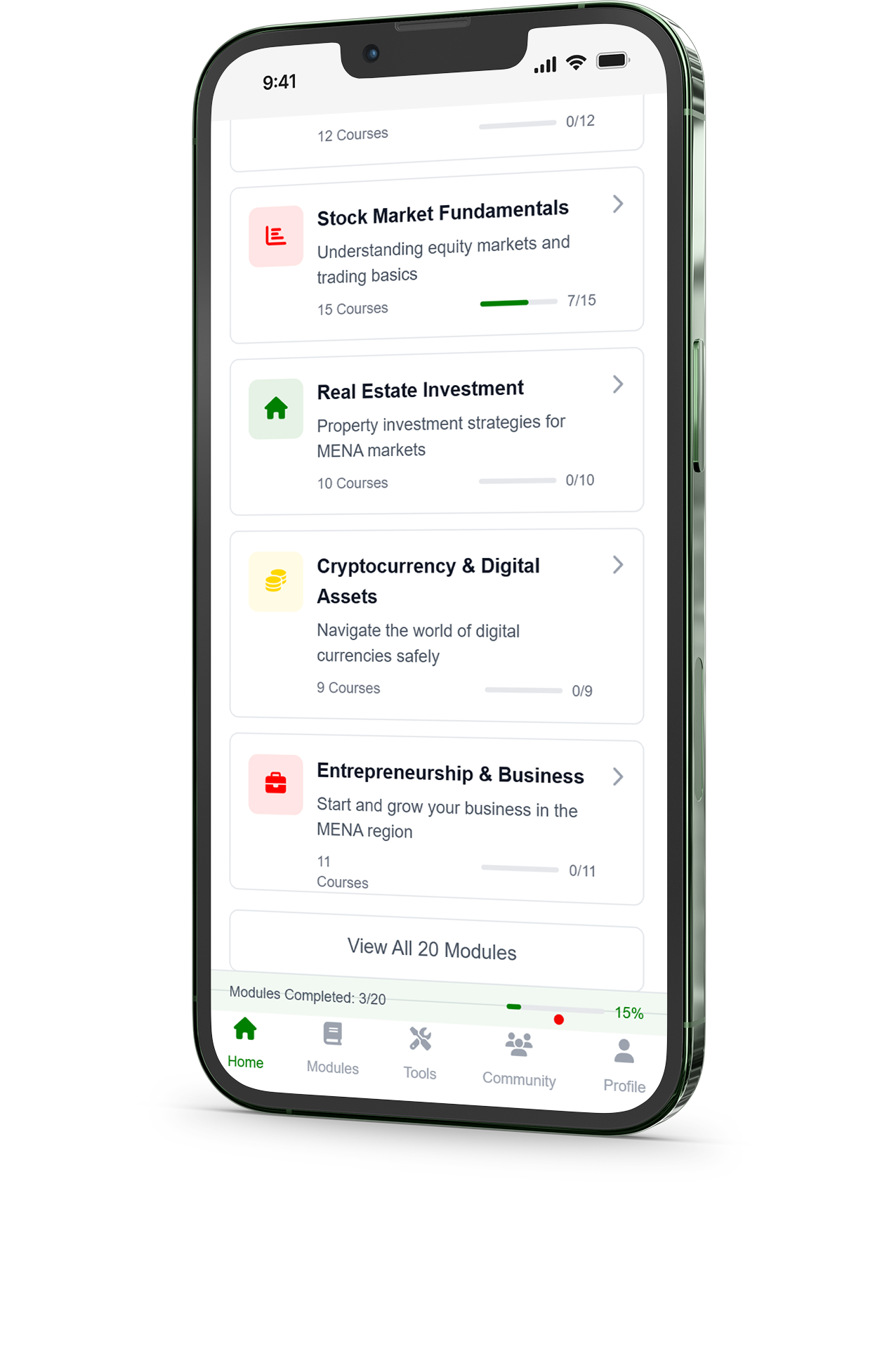 Learn in Arabic or English with offline access, perfect for UAE’s busy lifestyle. Courses are accessible anytime, anywhere, ensuring you master finances on your terms, wherever you are. Plus more coming.