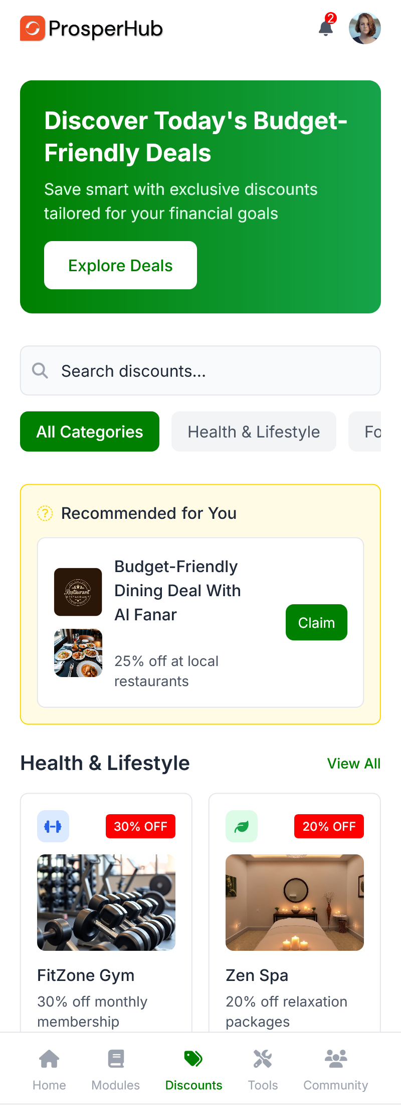 Our "Discounts" section offers daily retail deals (e.g., 20% off dining, gym memberships) tied to budgeting courses, helping you save while learning. With 2M-5M+ impressions per ad in Year 1, deals will reach our thousands of users, who check frequently (78% of UAE consumers seek app discounts). This creates a seamless buying experience, boosting savings and retailer loyalty.